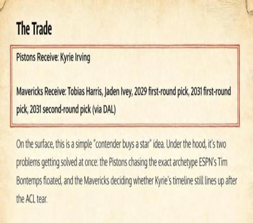 具体方案为,活塞送出哈里斯、艾维、2029年、2031年的首轮签,以及2031年的次轮签,从独行侠引入欧文。