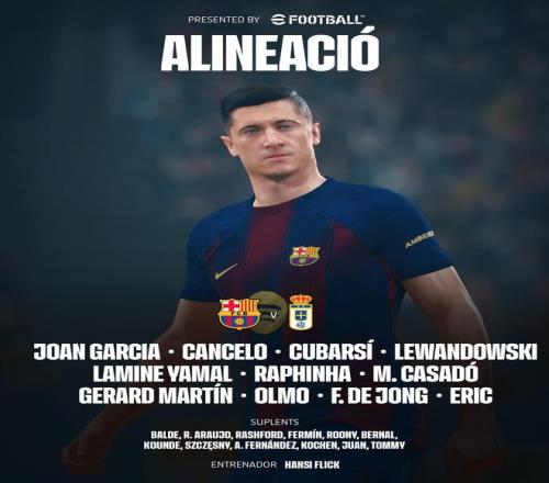 巴萨首发:13-霍安-加西亚、2-坎塞洛、5-库巴西、18-赫拉德-马丁、24-埃里克-加西亚、17-卡萨多、21-德容、10-亚马尔、20-奥尔莫、11-拉菲尼亚、9-莱万