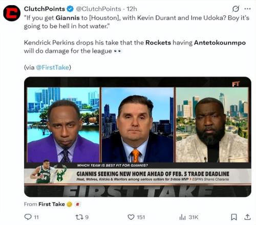 北京时间1月30日,在First Take节目中,三位名嘴谈到扬尼斯的下家,帕金斯再一次建议扬尼斯空降休斯顿,他表示如果你把扬尼斯放到火箭队,他的身边有杜兰特,再加上乌度卡的执教,那将是非常恐怖的存在。杜兰特与乌度卡可以最大化释放扬尼斯的统治力。