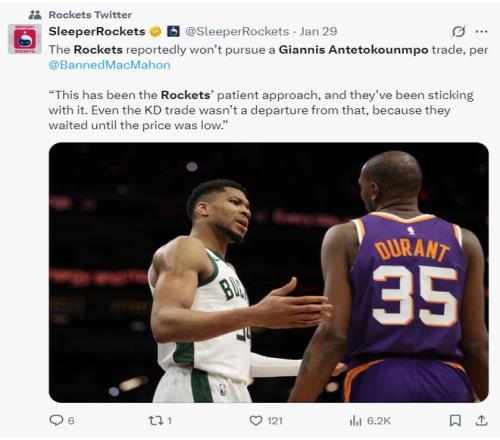 不过ESPN的记者麦克马洪透露,火箭似乎没有考虑交易得到扬尼斯,因为这是火箭的一贯策略,目前扬尼斯的要价太高,他们就算要出手都要等扬尼斯的要价下跌时,就跟交易杜兰特是一样的策略,等到价格降到最低点才出手。