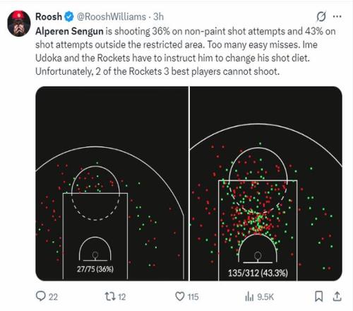 休媒Roosh写道:申京在罚球线外的命中率只有36%,在禁区外的投篮命中率只有43%,大多数的投篮他都无法把握。乌度卡与火箭必须要求他改变投篮方式,更不幸的是火箭队内有三位最佳球员其中两人不会投篮。